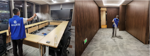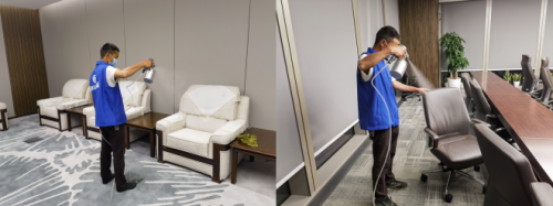 施工第1道:完全分解空氣中游離態污染物,采用方法:全空間霧化技術(空調新風窗戶需關閉)。